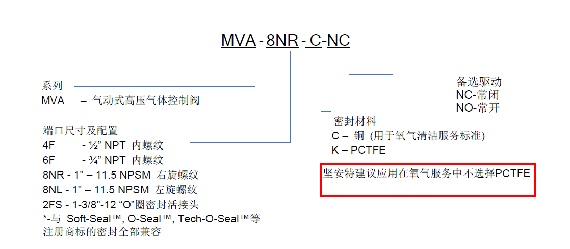 MVA系列氣動(dòng)高壓氣體控制閥適用于高要求的自動(dòng)化氣氣瓶充裝工廠、匯流排和管線系統(tǒng)。高壓氧氣服務(wù)的閥門密封選項(xiàng)C, 依據(jù)ISO7291(氧氣壓力沖擊測試)和ASTM G175(引燃測試),經(jīng)由第三方檢測,非氧氣環(huán)境下,采用PCTFE密封,密封選項(xiàng)K。MVA系列閥門可以設(shè)定為長開(-NO)或常閉(-NC),有多重端口配置。常閉式閥門進(jìn)口壓力達(dá)5500PSI無泄漏,而且只需85PSI的壓力就可以完全使用閥門打開。